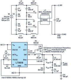 圖7. LTspice LISN電路、LT8618降壓轉(zhuǎn)換器和寄生建模