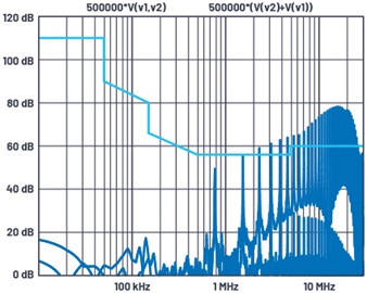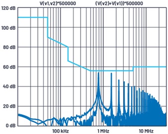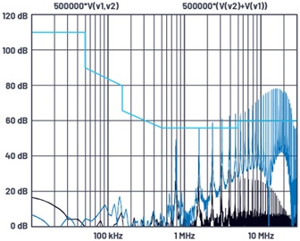 圖11. LTspice FFT圖和EN 55022傳導(dǎo)輻射限值線