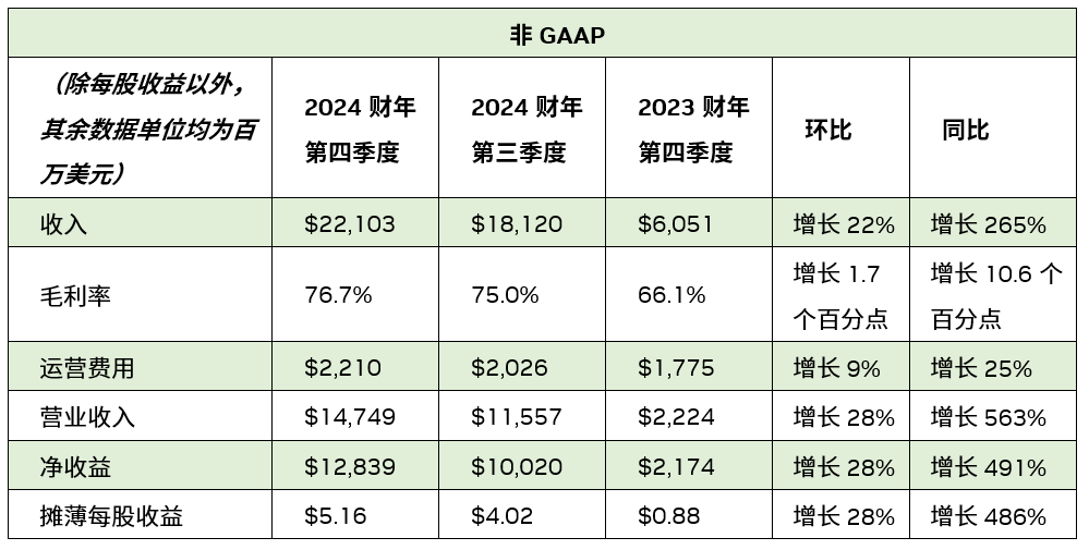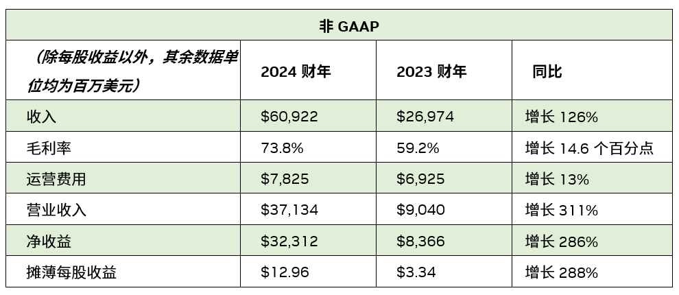 2024 財年收入增長 126%,達到 609 億美元。全年 GAAP 攤薄每股收益為 11.93 美元,較上一財年增長 586%。全年非 GAAP 攤薄每股收益為 12.96 美元,較上一財年增長 288%。