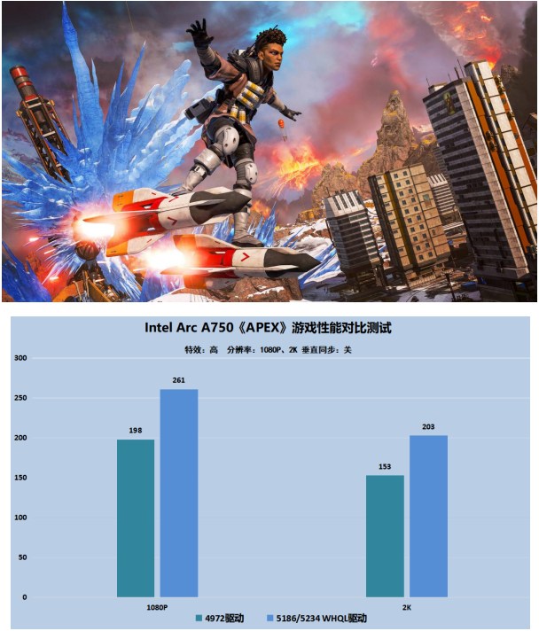 我們再來看看熱門的電子競技網(wǎng)絡(luò)游戲《APEX》,這款游戲需要非常高的幀數(shù)來支撐玩家們的競技體驗,幀數(shù)越多越能發(fā)揮出玩家們的實力,在4972版本中,A750顯卡運(yùn)行游戲1080P下幀數(shù)在198FPS左右,但是在新版本驅(qū)動中,游戲的幀數(shù)暴增了60多幀來到了261FPS!而在2K分辨率下我們的游戲幀數(shù)也可以在新驅(qū)動加持下來到200FPS以上的超強(qiáng)幀率,這時領(lǐng)先老版本驅(qū)動近50FPS,二者的差距極為顯著。