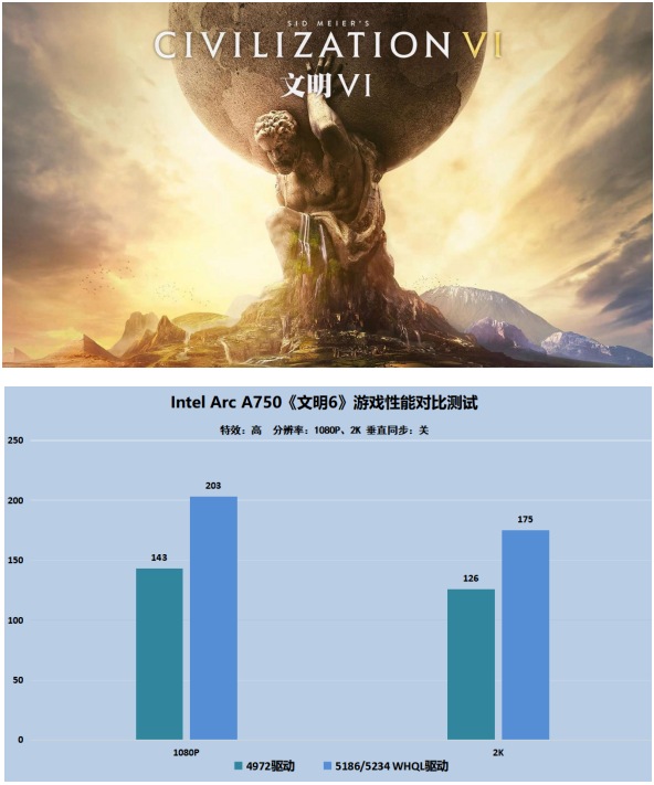接下來是非常經(jīng)久不衰的回合制策略游戲《文明6》,這款游戲在A750顯卡上運(yùn)行的效果非常令人滿意,在1080P下甚至可以超過200FPS,在2K下也可以達(dá)到175FPS的超高水平,遙遙領(lǐng)先老驅(qū)動高達(dá)40%以上!