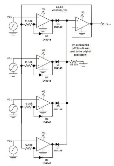 在該電路中,具有最大正值輸出的放大器通過放大器輸出中的正向偏置二極管來控制負反饋路徑。它通過R1、R2、R3或R4(具體取決于哪個通道具有最大正值)構成一個簡單的單位增益路徑進入放大器的反相輸入。反相輸入與輸出之間的二極管在具有最大輸入的放大器上反向偏置,最終電路作為其輸入與總輸出之間的單位增益放大器。