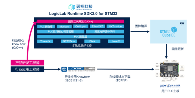 翌控科技基于STM32系列處理器提供全新LogicLab Runtime SDK 2.0版本,基于標(biāo)準(zhǔn)開發(fā)板集成Eclipse ThreadX組件、板級(jí)驅(qū)動(dòng)、PLC核心庫移植、現(xiàn)場(chǎng)總線通訊庫、運(yùn)動(dòng)控制庫實(shí)現(xiàn)等等功能,實(shí)現(xiàn)開箱即用,大幅削減基礎(chǔ)平臺(tái)研發(fā)投入。LogicLab Runtime SDK可直接通過STM32CubeIDE導(dǎo)入工程,并進(jìn)行編譯并生成固件,同時(shí)可基于C/C++對(duì)PLC核心功能進(jìn)行擴(kuò)展,完全固化行業(yè)核心Knowhow,從而實(shí)現(xiàn)獨(dú)特的PLC控制器產(chǎn)品,核心架構(gòu)圖如下:
