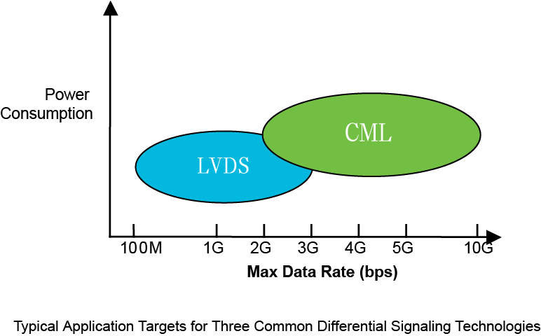 當(dāng)Data Rate低于2Gbps時,LVDS的應(yīng)用更為廣泛,其功耗更低,抗干擾強(qiáng),較寬的共模電壓范圍讓互連的要求變得很低。LVDS還有支持多點(diǎn)互連的M-LVDS和B-LVDS標(biāo)準(zhǔn),可以多節(jié)點(diǎn)互連,應(yīng)用場景非常豐富。當(dāng)Datarate高于3.125Gbps就必須要使用CML了。當(dāng)Data Rate在2G到3.125Gbps之間時,要綜合考慮功能性,性能,和功耗的平衡。比如說傳輸距離較長,但信號品質(zhì)要求又很高的時候,考慮用CML;傳輸距離較短,要求長續(xù)航,低功耗的時候,考慮用LVDS。