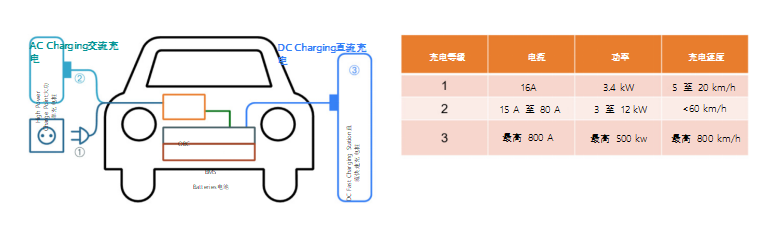 圖 2 顯示了交流充電和直流充電之間的差異。對于交流充電(圖 2 左側(cè)),車載充電器 (OBC) 插入標(biāo)準(zhǔn)交流插座。OBC 將交流電轉(zhuǎn)換為適當(dāng)?shù)闹绷麟姙殡姵爻潆?。對于直流充電(圖 2 右側(cè)),充電樁直接給電池充電。