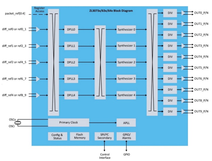 在DU、CU和RU設(shè)備中,可以部署振蕩器、可編程鎖相環(huán)(PLL)IC、緩沖器和抖動衰減器等網(wǎng)絡(luò)同步硬件。此外,現(xiàn)在已經(jīng)有專用的單芯片網(wǎng)絡(luò)同步解決方案。在這方面,Microchip是首家將自研ZL3073x/63x/64x平臺(圖3)推向市場的公司。這項(xiàng)技術(shù)將DPLL、低輸出抖動合成器、IEEE 1588-2008精密時間協(xié)議棧和同步算法軟件模塊結(jié)合在一起。
