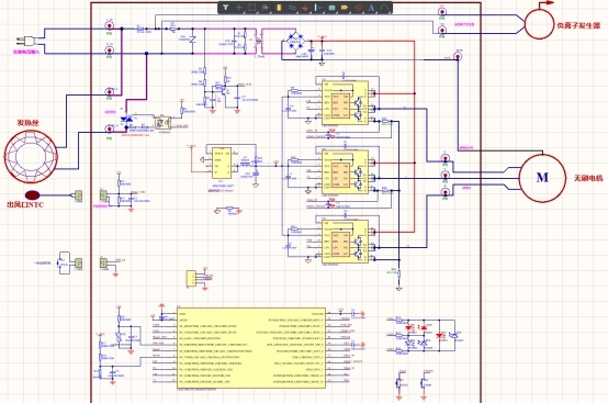 此外,秋冬季吹頭發(fā)時(shí)還需要更多的熱量,因此也要加上過溫保護(hù)功能:用MCU實(shí)時(shí)監(jiān)控發(fā)熱絲溫度,緊急情況下可以關(guān)掉發(fā)熱絲,而且發(fā)熱絲內(nèi)部也有過流過溫保護(hù)。