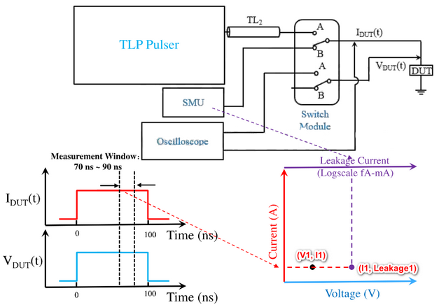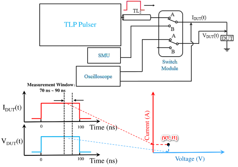 1、使用TLP pulser發(fā)出脈沖,使用示波器和對(duì)應(yīng)的探頭、測(cè)試線(xiàn)纜、衰減器等測(cè)試DUT端對(duì)應(yīng)的電壓電流,描繪響應(yīng)的曲線(xiàn)。TLP Pulser打出指定電壓V1的脈沖,示波器記錄下電流I1。