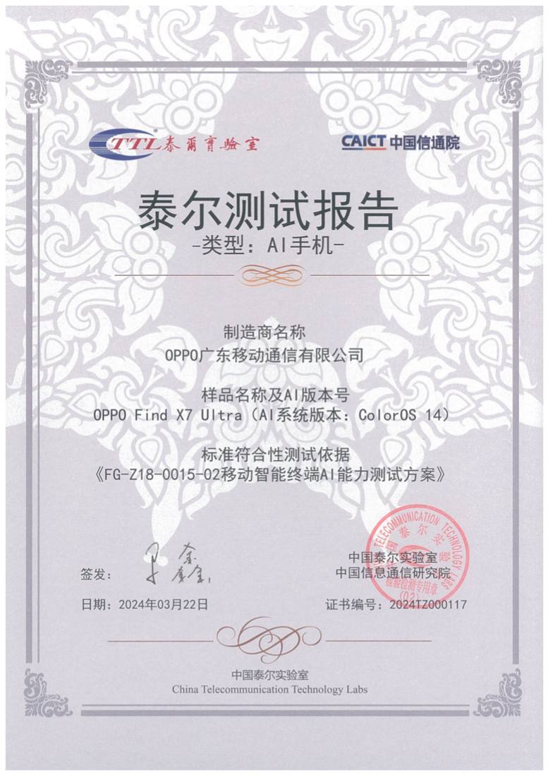 中國(guó)泰爾實(shí)驗(yàn)室表示,F(xiàn)ind X7系列AI手機(jī)是支持生成式 AI 的智能終端硬件平臺(tái),提供多個(gè)基于AI大模型的生成式功能和服務(wù),具備用戶可定制化的智能服務(wù)和多模態(tài)交互方式,產(chǎn)品提升了用戶高頻、高感知、復(fù)雜任務(wù)場(chǎng)景的需求體驗(yàn)。