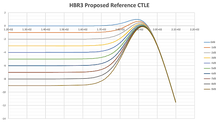 CTLE的實現(xiàn)方法和FIR濾波器有點像,實現(xiàn)的是一個近似帶通濾波器的效果。下圖是一組典型的CTLE濾波器,低頻衰減大,而高頻衰減小。這個濾波曲線,和傳輸鏈路的損耗正好形成互補(傳輸鏈路插入損耗是低頻衰減小,而高頻衰減大)。在接收端,實現(xiàn)了不同頻率間均勻的總體損耗,從而降低了ISI抖動。CTLE和DFE/FFE不同,它不依賴參考時鐘,在連續(xù)時間域上對信號進行均衡;而DFE/FFE是數(shù)字域上的均衡,必須要先有參考時鐘,來區(qū)分不同的bit,才能進行均衡。接收端常常使用CTLE和DFE的組合,先用CTLE打開近乎閉合的眼圖,恢復出時鐘,再用DFE進一步均衡補償。
