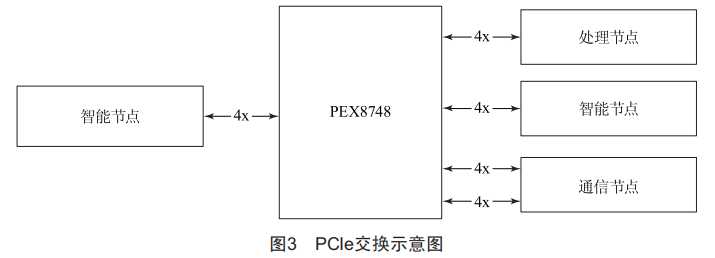 智能處理模塊中PEX8748配置多個(gè)4X通道,用于連接通用處理節(jié)點(diǎn)、智能計(jì)算節(jié)點(diǎn)和通信節(jié)點(diǎn),如圖3所示。