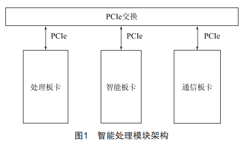 智能處理模塊主要由智能、處理、通信三個(gè)板卡組成。智能板卡包括兩個(gè)智能處理器+FPGA,主要實(shí)現(xiàn)深度神經(jīng)網(wǎng)絡(luò)加速處理以及通信板卡的配置和管理;處理板卡設(shè)計(jì)兩個(gè)CPU處理器,主要實(shí)現(xiàn)復(fù)雜通用計(jì)算任務(wù);設(shè)計(jì)一個(gè)PCIe交換芯片,用于模塊內(nèi)部各節(jié)點(diǎn)之間高速通信;通信板卡采用FPGA實(shí)現(xiàn)通信邏輯,實(shí)現(xiàn)對(duì)外通信。