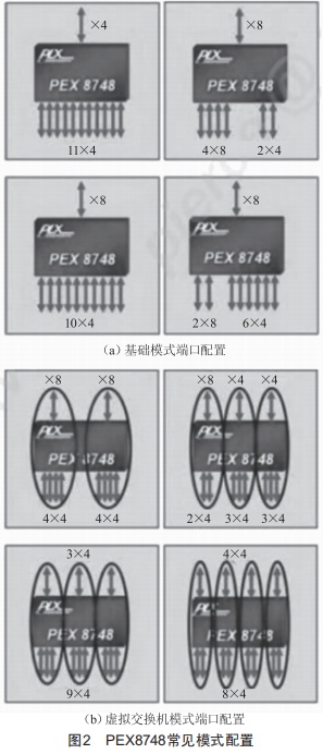 PEX8748可實(shí)現(xiàn)多種配置模式,能夠根據(jù)具體需求自由設(shè)置為上下行模式及多種端口組合,如圖2所示。