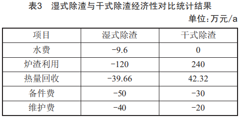 干渣機(jī)改造后提高了渣的回收利用率,減少了廢渣的處理和處置成本。此外,改造后的干渣機(jī)自動(dòng)化程度更高,能實(shí)現(xiàn)智能化控制,提高了生產(chǎn)效率和運(yùn)行穩(wěn)定性,可以降低能源消耗和維護(hù)成本,從而降低企業(yè)的運(yùn)營(yíng)成本。改造后經(jīng)過長(zhǎng)期運(yùn)行統(tǒng)計(jì),干渣除渣經(jīng)濟(jì)性優(yōu)勢(shì)較為明顯,對(duì)比結(jié)果如表3所示。