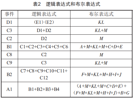 根據(jù)故障樹(shù)模型,建立事件發(fā)生概率的邏輯表達(dá)式和布爾表達(dá)式,如表2所示。