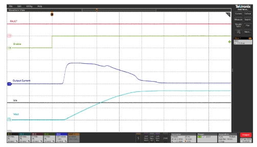 使用上述公式和圖 5,用戶可以設(shè)置導(dǎo)通容性負(fù)載時(shí)的最大浪涌電流。下面的圖 6 和圖 7 提供了一個(gè)測(cè)試用例: