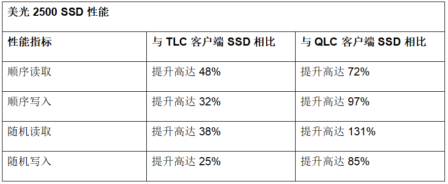 美光副總裁暨客戶端存儲事業(yè)部總經理 Prasad Alluri 表示:“隨著行業(yè)轉向 QLC 存儲,美光在客戶端 SSD 市場上繼續(xù)保持領先地位并持續(xù)創(chuàng)新。美光 2500 SSD 提供卓越的用戶體驗和價值定位,將進一步加速 QLC 在 PC 中的普及?!?