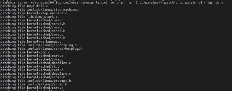 hjx@myir-server:~/renesas/04_Sources/myir-renesas-linux$ for p in `ls -1 ../patches/*.patch`; do patch -p1 < $p; done