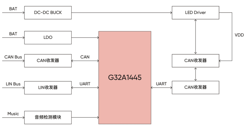 該方案通過音頻采集端提供的數(shù)據(jù),經(jīng)由G32A1445快速計算處理,精準(zhǔn)把控音頻的頻域,使音頻和燈光的聯(lián)動更加生動形象;同時使用車規(guī)CAN通信進行數(shù)據(jù)傳輸,聯(lián)動多路LED,實現(xiàn)同步運行。