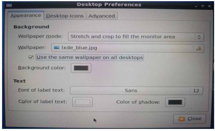 登錄成功后,由于默認(rèn)背景是黑色的,可以點擊鼠標(biāo)右鍵后選擇Desktop Preferences->Appearance->Wallpaper(/usr/share/lxde/wallpapers/lxde_blue.jpg)來選擇背景圖片,如圖4-2: