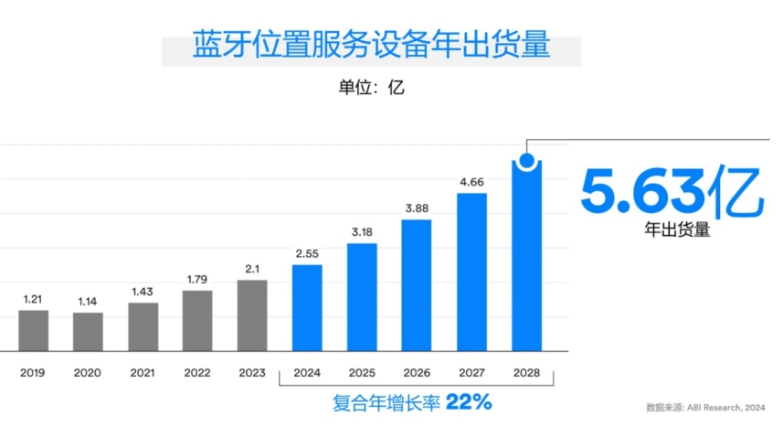 由于市場(chǎng)對(duì)高精度定位服務(wù)的需求日益增長(zhǎng),藍(lán)牙技術(shù)被廣泛用作一種設(shè)備定位技術(shù)。借助目前的藍(lán)牙設(shè)備,藍(lán)牙技術(shù)擁有其他定位無(wú)線電所不具備的靈活性和便利性。即將推出的“Channel Sounding”規(guī)范有望實(shí)現(xiàn)極其精準(zhǔn)的測(cè)距,為當(dāng)前的實(shí)時(shí)定位系統(tǒng)(RTLS)帶來(lái)更多優(yōu)勢(shì),包括更高的精度和安全性等。預(yù)計(jì)未來(lái)五年藍(lán)牙位置服務(wù)設(shè)備的年均增長(zhǎng)率為22%,到2028年出貨量將達(dá)到5.63億臺(tái)。