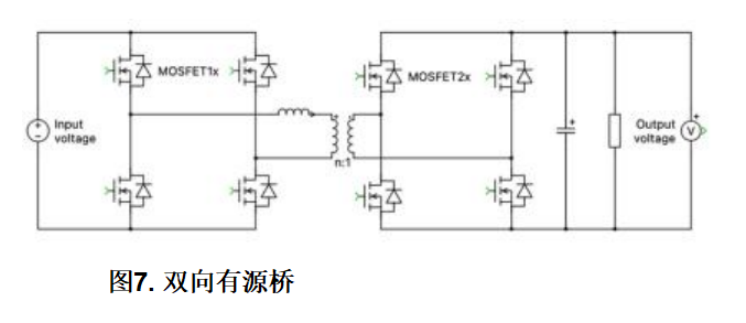 雙有源橋(DAB)是最常見的隔離型雙向拓?fù)渲?。如圖7所示,其在初級側(cè)和次級側(cè)均采用了全橋配置。每個(gè)橋通過移相控制,即控制相對于彼此相位偏移的方波,來控制功率流方向。此拓?fù)涞囊恍﹥?yōu)點(diǎn)包括:每個(gè)開關(guān)上的電壓應(yīng)力限于母線電壓、兩側(cè)所有開關(guān)上的電流應(yīng)力大致相等,以及無需額外元件(如諧振電路)即可實(shí)現(xiàn)軟開關(guān)。一些缺點(diǎn)則是由于高電流紋波,濾波電路至關(guān)重要,且在輕載條件下轉(zhuǎn)換器的軟開關(guān)能力可能會(huì)失效。