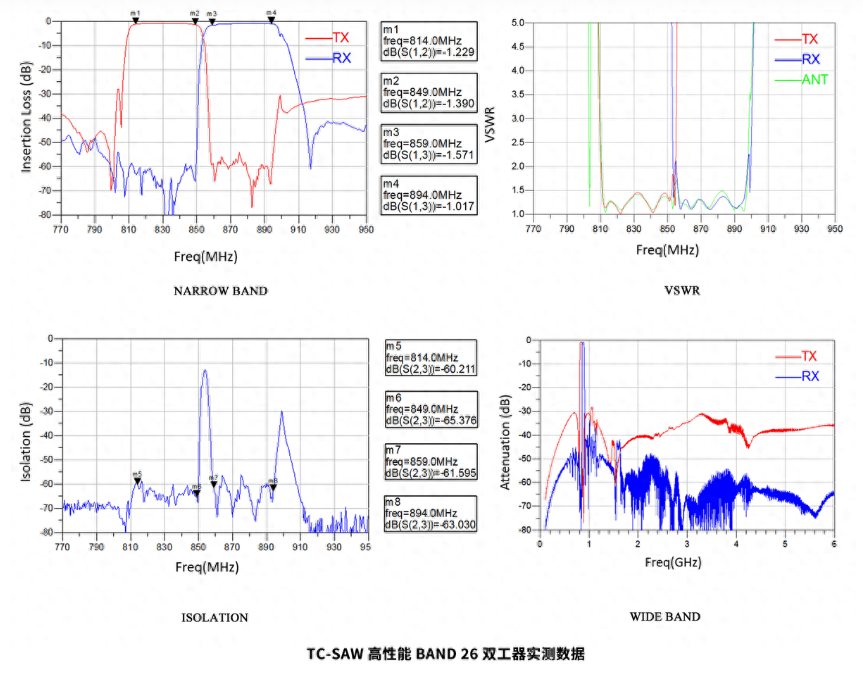 TC-SAW高性能Band26雙工器具有優(yōu)異的帶內(nèi)帶外性能,TX帶內(nèi)插損典型值僅有1.4dB,RX帶內(nèi)插損典型值1.6dB(國外主流廠商該頻段產(chǎn)品TX和RX插損典型值一般在1.6dB和1.8dB),在TX頻率段和RX頻率段的隔離度典型值分別為59和56,TX的二倍頻抑制達到45dB。