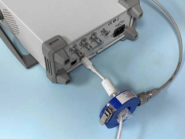 接下來,使用高頻電流探頭測量附加的共模電纜電流(包括電源電纜),例如Com Power CLCE-400或同等產(chǎn)品(圖3)。記錄頂部幾個諧波的位置,并與近場探測確定的列表進行比較。這些諧波最有可能會輻射并導(dǎo)致測試失敗,因為它們流經(jīng)類似天線的結(jié)構(gòu)(電纜)。