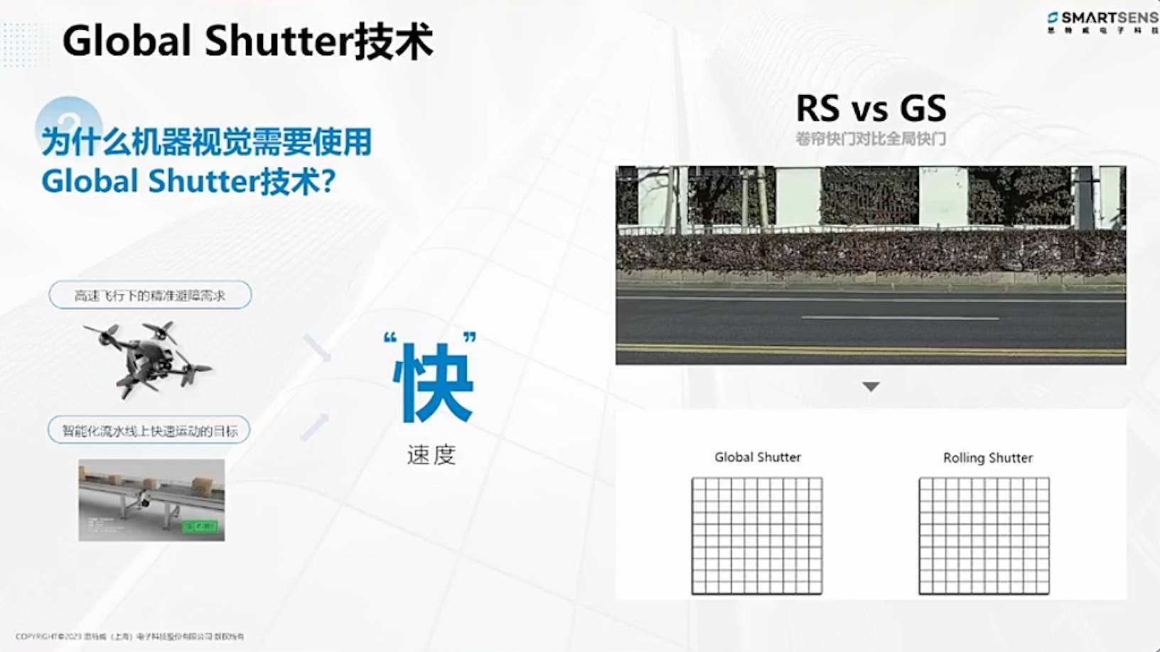 據(jù)思特威銷售總監(jiān)宗翔(Will Zong)介紹:“全局快門的傳感器,會分為全局快門和卷簾快門兩種技術(shù),可能一般的用戶,會覺得說,全局快門和卷簾快門的區(qū)別是什么,大家第一反應(yīng)是快一些,但是這個快,并不是大家認為意義上的拍攝速度快,確實全局快門的產(chǎn)品,參數(shù)上幀率會達到120幀,或者240幀甚至更高,卷簾快門一般做一些監(jiān)控類應(yīng)用的話,幀率只有30幀,但是這個快是指,全局快門更適合于拍攝快速移動的物品,這個才是全局快門和卷簾快門最主要的區(qū)別。”