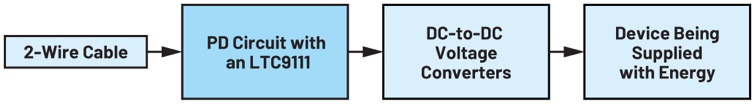 圖3顯示采用LTC9111的PD接收器電路的方框圖。通過雙線電纜供電。PD電路負(fù)責(zé)對線路傳輸進行分類和監(jiān)控。通過分類確定電能傳輸?shù)墓β实燃墶H绻\行的電氣設(shè)備需要24 V或55 V以外的電壓,則需要使用額外的DC-DC轉(zhuǎn)換器。