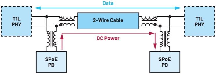 與PoE一樣,SPoE既可傳輸數(shù)據(jù),也能傳輸電力。這一點很重要,因為遠(yuǎn)程電子設(shè)備通常需要電源和數(shù)據(jù)連接。圖1顯示T1L PHY模塊的情況。
