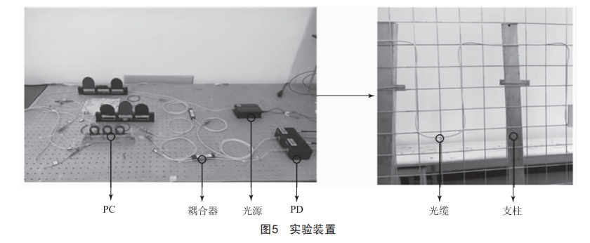 本節(jié)搭建了M—Z周界防護(hù)實(shí)驗(yàn)裝置以驗(yàn)證圖2所示結(jié)構(gòu)模型的性能,實(shí)物圖如圖5所示。其中光源使用低RIN窄線寬激光器;PD使用PIN光電二極管,響應(yīng)頻率為10 MHz;數(shù)據(jù)采集卡使用PCI采集卡,采樣率為20 MHz;光纜長(zhǎng)度為6 km,為模擬實(shí)際工程應(yīng)用,在光纜5 km處將其以u(píng)型方式捆綁在防護(hù)網(wǎng)上。