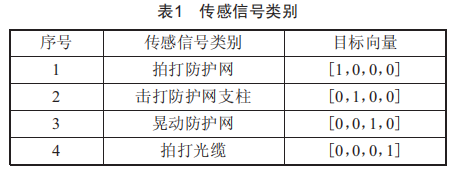 具體測(cè)試方法如下:4種類型的傳感信號(hào)分別采集40組'得到160組樣本用于BP神經(jīng)網(wǎng)絡(luò)的學(xué)習(xí);另外'再對(duì)每種類型的傳感信號(hào)分別采集10組'得到40組測(cè)試樣本對(duì)完成學(xué)習(xí)的BP神經(jīng)網(wǎng)絡(luò)進(jìn)行測(cè)試。將輸出向量中的最大元素置1'其他元素置0'那么可能結(jié)果為[1'0'0'0]、[0'1'0'0]、[0'0'1'0]和[0'0'0'1]'如表1所示。其中'[1'0'0'0]代表拍打防護(hù)網(wǎng)'[0'1'0'0]代表?yè)舸蚍雷o(hù)網(wǎng)支柱'[0'0'1'0]代表晃動(dòng)防護(hù)網(wǎng)'[0'0'0'1]代表拍打光纜。