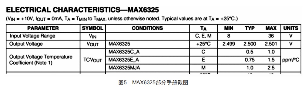 測試結(jié)果分析:通過對比測試數(shù)據(jù),發(fā)現(xiàn)MAX6325 基準(zhǔn)源下的MS16E020轉(zhuǎn)換精度略高于REF5025基準(zhǔn) 源 ,與手冊一致[2-3]。REF5025和MAX6325部分手冊截 圖如圖4、圖5所示。