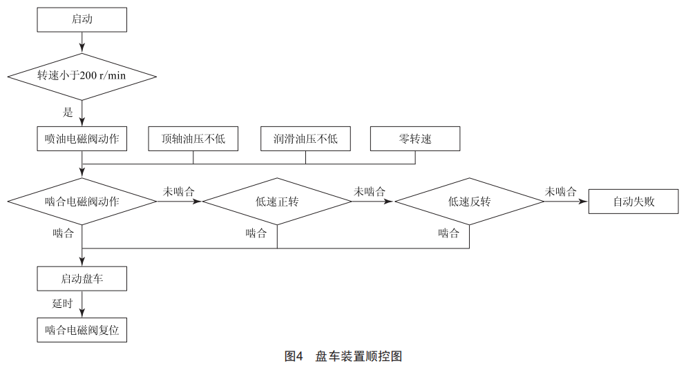 對(duì)于邏輯實(shí)現(xiàn),部分盤車系統(tǒng)采用就地PLC(Programmable Logic Controller)控制,其邏輯都由PLC實(shí)現(xiàn),DCS(Distributed C0ntr0l System)只有指令和狀態(tài),不利于運(yùn)行狀態(tài)監(jiān)視且設(shè)備較多。當(dāng)前,DCS已完全可以實(shí)現(xiàn)PLC的控制功能,為精簡設(shè)備,節(jié)約設(shè)備成本,提高設(shè)備的穩(wěn)定性,盤車裝置的控制由DCS實(shí)現(xiàn)。原啟動(dòng)邏輯只有一次嚙合,嚙合成功率較低,無法在遠(yuǎn)方調(diào)整位置且投用時(shí)間過長,延誤投入。