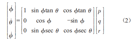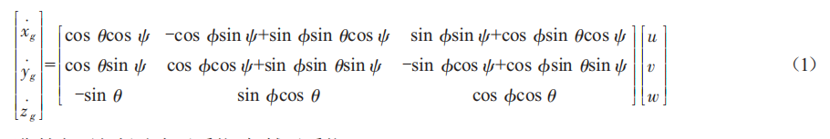 式中:[x●g,y●g,z●g]為地面坐標系下無人機的速度分量;φ,θ,ψ分別為無人機在機體坐標系下的俯仰角、橫滾角和偏航角;[u,v,w]為機體坐標系下的無人機速度分量o