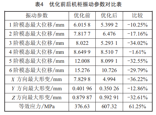 優(yōu)化前后機(jī)柜振動(dòng)最大位移和隨機(jī)振動(dòng)3個(gè)方向最大形變對(duì)比如表4所示。