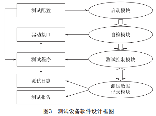 各功能模塊詳細(xì)描述如下:1)啟動(dòng)模塊:對(duì)軟件進(jìn)行初始化檢測(cè),檢測(cè)內(nèi)容包括數(shù)據(jù)庫、配置文件、用戶權(quán)限等。2)自檢模塊:對(duì)測(cè)試設(shè)備的測(cè)試資源進(jìn)行自檢,確認(rèn)其可用狀態(tài)。3)測(cè)試控制模塊:可分別讀取兩被測(cè)件的測(cè)試配置文件,加載對(duì)應(yīng)自動(dòng)測(cè)試流程,依序輸出控制信息,按配置循環(huán)調(diào)用測(cè)試程序,并監(jiān)控其運(yùn)行過程中可能發(fā)出的告警信息'獲取測(cè)試結(jié)果并顯示。4)測(cè)試數(shù)據(jù)記錄模塊:與測(cè)試控制模塊交互'持續(xù)獲取測(cè)試相關(guān)數(shù)據(jù)并記錄在日志中'在測(cè)試結(jié)束后生成指定格式測(cè)試報(bào)告(如word),可支持產(chǎn)品排故等。
