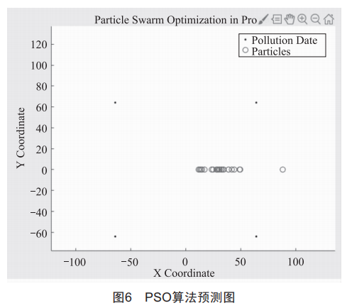 在將克里金插值的虛擬節(jié)點(diǎn)值用于改進(jìn)的高斯煙羽模型后,發(fā)現(xiàn)對于僅僅用克里金插值預(yù)測污染源而言,利用高斯煙羽模型得到的結(jié)果更加符合實(shí)際擴(kuò)散規(guī)律,但由于考慮了建筑物的影響,需要利用PSO算法確定最終污染源位置。圖6為PSO預(yù)測的結(jié)果,將圖6中的結(jié)果代入改進(jìn)后的高斯煙羽模型中,并用均方根誤差作為比較結(jié)果,選擇誤差最小的點(diǎn)作為污染源。結(jié)果表明,利用兩種算法共同預(yù)測的位置相較于單獨(dú)使用克里金插值的結(jié)果更加精準(zhǔn),驗(yàn)證了本文算法的有效性。