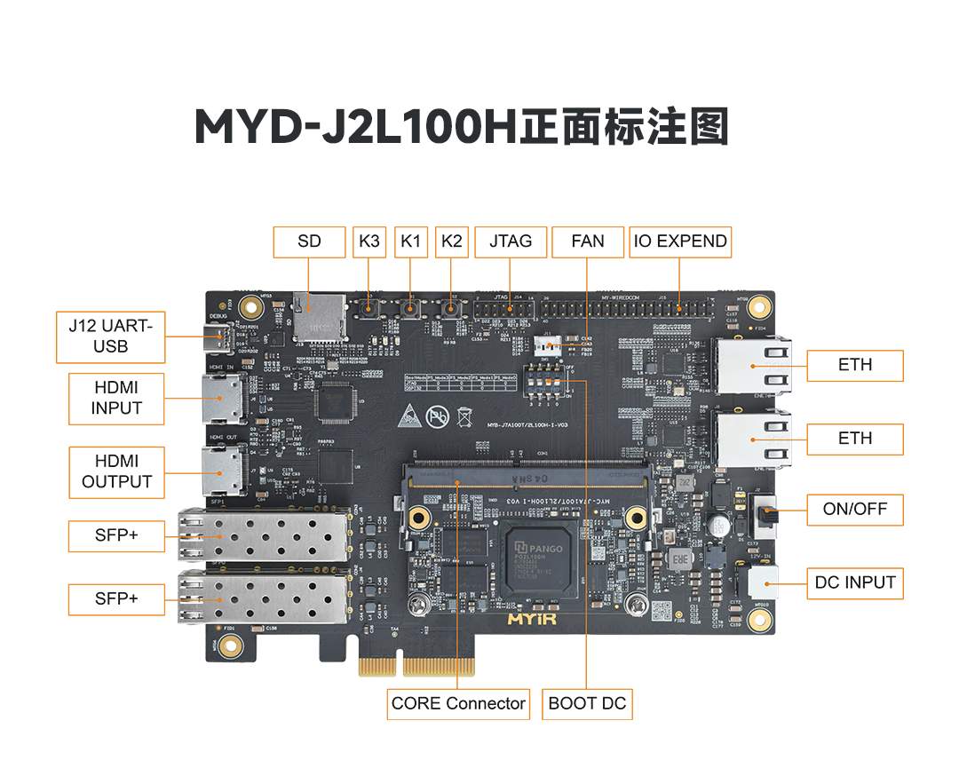 MYD-J2L100H開發(fā)板,采用12V/2A直流供電,搭載了2路千兆以太網(wǎng)接口、2路SFP+接口、1路PCIE2.0、1路HDMI輸入、1路HDMI輸出、1路攝像頭、1路Micro SD接口、1路USB-UART接口、1路FAN接口及一路擴(kuò)展口。