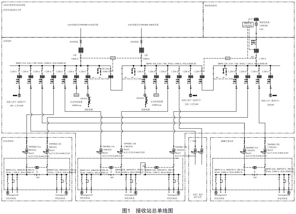 海工承攬某接收站項目電氣設(shè)計,電氣設(shè)計總體單線圖如圖1所示。