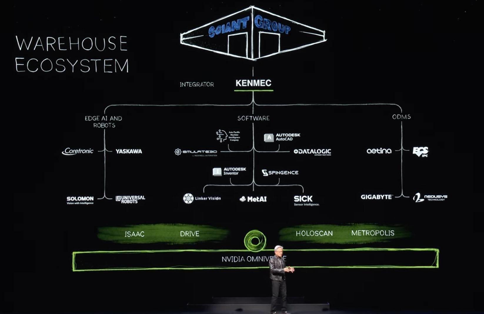 黃教主在Computex展示了一個來自KENMEC為Giant Group打造的倉儲生態(tài)系統(tǒng)。在這其中,KENMEC負(fù)責(zé)將來自EdgeAI和機(jī)器人、軟件、ODM的三部分整合在一起,打包成一個完整的智慧倉儲方案提供給Giant Group。