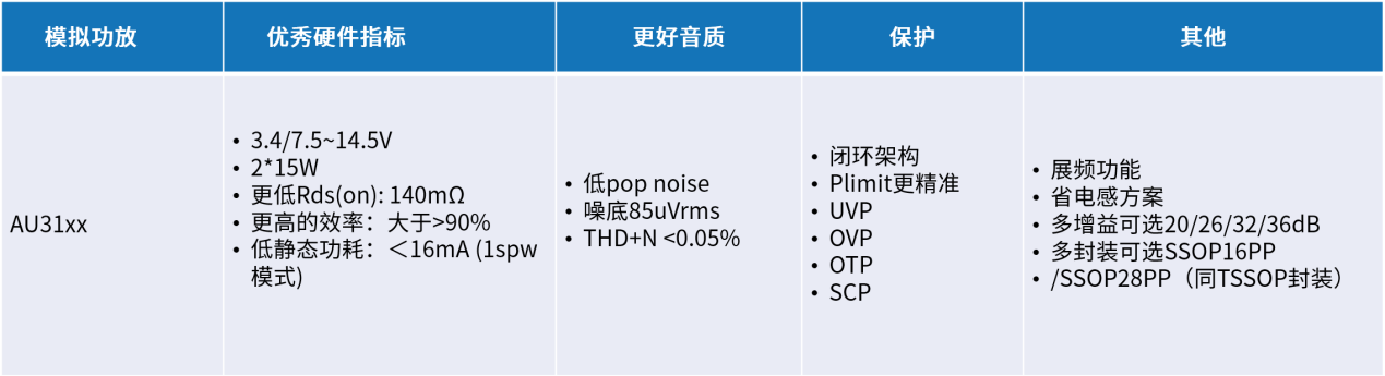 對于低成本電視和投影儀等產(chǎn)品,我們設計了8~14.5V輸入電壓范圍的模擬功放AU3138M(20/26dB)和AU3138P(32/36dB)。這些型號同樣支持外部調(diào)節(jié)增益,滿足多樣化的增益配置需求。特別地,7.4V的欠壓設計有效控制了掉電時的瞬態(tài)噪聲(pop noise),提升了音質(zhì)表現(xiàn)。