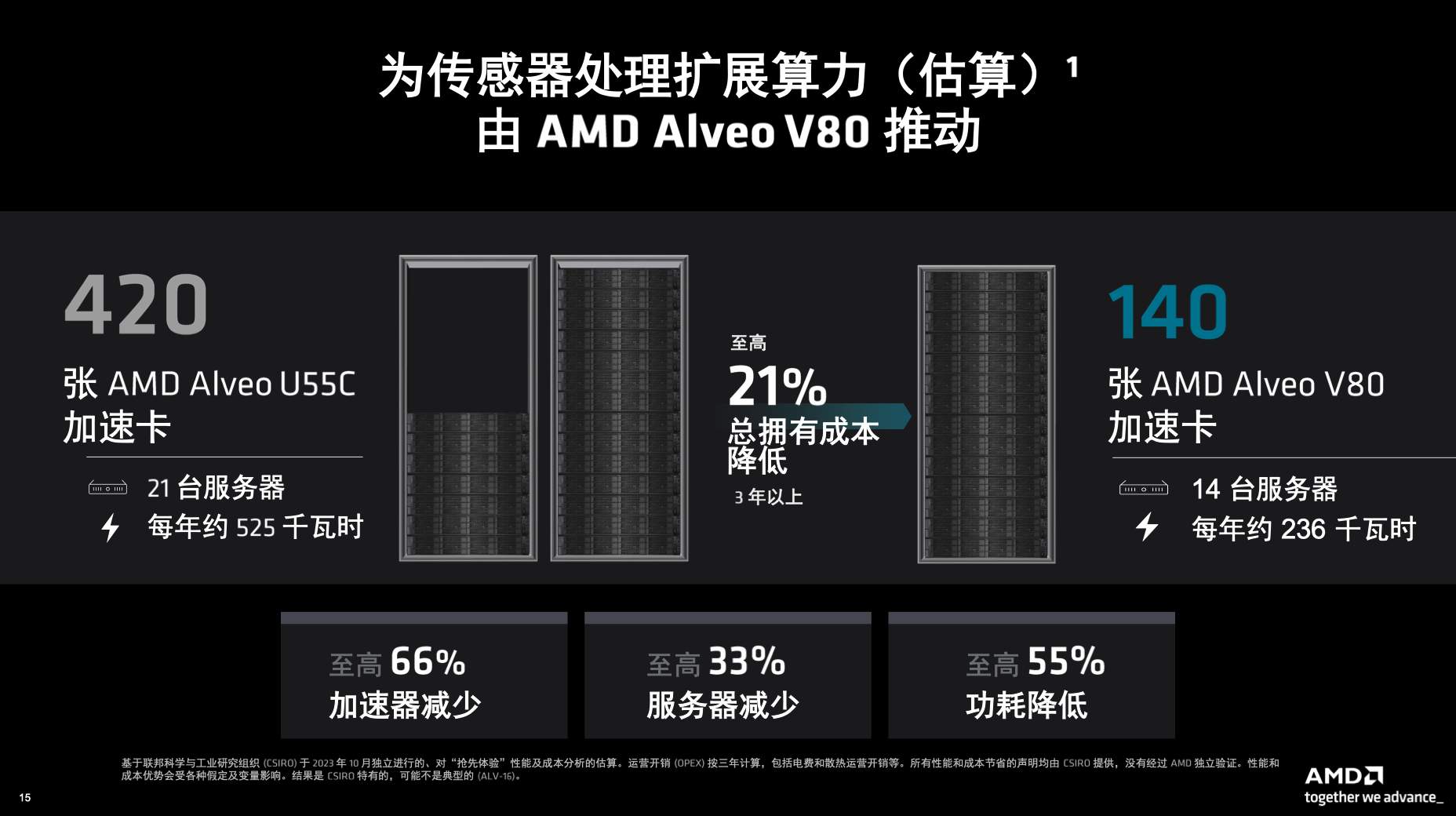 據(jù)Shyam Chander分享,通過Alveo V80帶來的壓縮加速和存儲(chǔ)容量增加,傳統(tǒng)上需要55臺(tái)服務(wù)器、1303個(gè)SSD驅(qū)動(dòng)器才能完成的計(jì)算負(fù)載,現(xiàn)在僅需21臺(tái)服務(wù)器、504個(gè)SSD驅(qū)動(dòng)器和42張V80加速卡即可完成。服務(wù)器成本降低了44%,功耗降低了55%,總擁有成本最高可以降低56%。