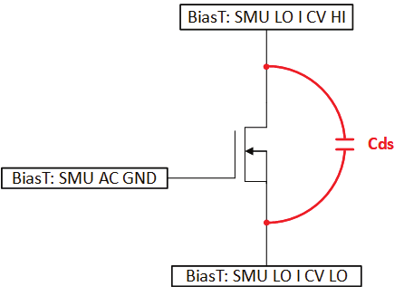 圖8顯示了CGS的配置,當(dāng)SMU在漏極處掃描直流電壓時(shí),該測(cè)試測(cè)量了MOSFET的柵極和源極之間的電容。圖9顯示了CDS的配置,當(dāng)SMU在漏極處掃描直流電壓時(shí),該測(cè)試測(cè)量了漏極和源極之間的電容。圖10顯示了CRSS配置。該測(cè)試測(cè)量MSMU掃掃漏極直流電壓時(shí)MOSFET的反向傳輸電容。
