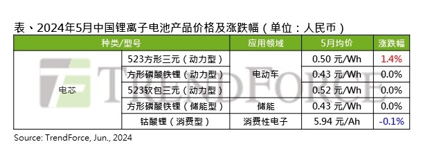 Jun. 6, 2024 ---- 根據(jù)TrendForce集邦咨詢最新研究顯示,今年一季度動(dòng)力電池產(chǎn)業(yè)鏈經(jīng)歷產(chǎn)能利用率低谷期后,3月以來(lái)市場(chǎng)需求明顯回暖,4月旺季行情需求爆發(fā),帶動(dòng)鋰電池產(chǎn)業(yè)排產(chǎn)回升,動(dòng)力電池價(jià)格略為回升。5月市場(chǎng)延續(xù)旺季行情,動(dòng)力電池需求平穩(wěn),連帶使得價(jià)格持穩(wěn),其中,方形三元、方形鐵鋰和軟包型三元?jiǎng)恿﹄娦救嗣駧旁戮鶅r(jià)分別為0.50元/Wh、0.43元/Wh和0.52元/Wh。