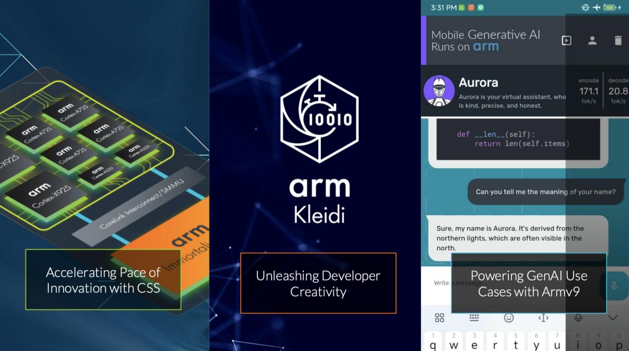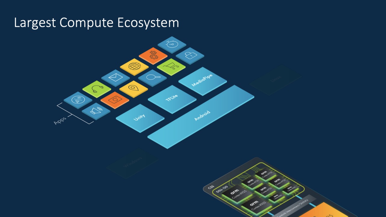值得一提的是,Arm終端計(jì)算子系統(tǒng)不僅僅是一個(gè)硬件平臺(tái)方案,而是一個(gè)融合了軟硬件協(xié)同優(yōu)化的系統(tǒng)設(shè)計(jì)方案??梢酝ㄟ^軟件和工具組合在 終端CSS 上進(jìn)一步優(yōu)化性能和功耗,Arm終端CSS結(jié)合了軟件以及世界上最大的移動(dòng)設(shè)備生態(tài)系統(tǒng),提供一個(gè)AI優(yōu)化計(jì)算平臺(tái)所需的計(jì)算性能和效率,將成為新一代終端AI產(chǎn)品和服務(wù)的基石。
