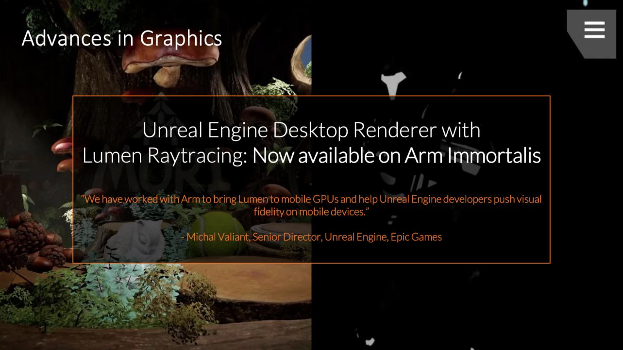 將光追引入移動(dòng)設(shè)備是Immortails的使命,而Arm一直致力于讓開發(fā)者盡可能輕松地在移動(dòng)設(shè)備上實(shí)現(xiàn)游戲主機(jī)級(jí)內(nèi)容。據(jù)James介紹,Arm正在與Epic Games合作,確保他們的桌面平臺(tái)渲染器能夠在其Immortails GPU上快速高效地運(yùn)行。今年,Arm還將持續(xù)開展全球范圍內(nèi)的開發(fā)者教育活動(dòng),以確保游戲開發(fā)者能夠?qū)⒏嗑蕛?nèi)容帶入到移動(dòng)設(shè)備中。