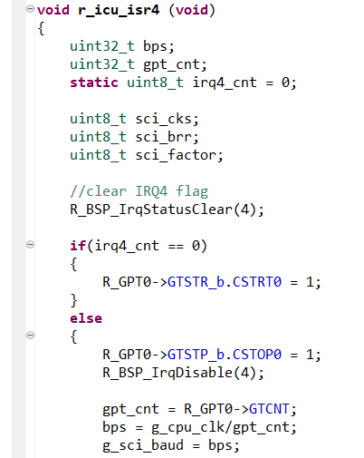 RA系列的開發(fā)環(huán)境中的FSP能夠以最簡(jiǎn)單的GUI的方式來配置外設(shè)并生成封裝好的底層驅(qū)動(dòng)代碼。但如果外設(shè)需要做動(dòng)態(tài)功能上的切換,例如串口IRQ接收等功能,就需要手動(dòng)通過寄存器配置來做動(dòng)態(tài)修改。下面的例子是一個(gè)簡(jiǎn)單的通過RXD管腳首先通過IRQ中斷觸發(fā)來偵測(cè)接收數(shù)據(jù)的start Bits時(shí)間,計(jì)算出實(shí)際波特率,然后做動(dòng)態(tài)波特率配置。這樣就能夠?qū)崿F(xiàn)波特率自適應(yīng)(偵測(cè))的功能。