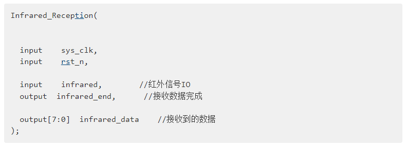 端口信號(hào)很簡(jiǎn)潔,當(dāng)接到一次紅外數(shù)據(jù)的時(shí)候,infrared_end,就會(huì)拉高一個(gè)周期。